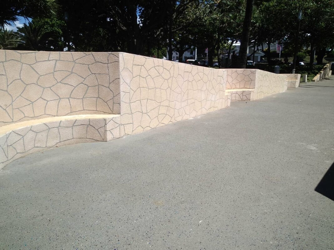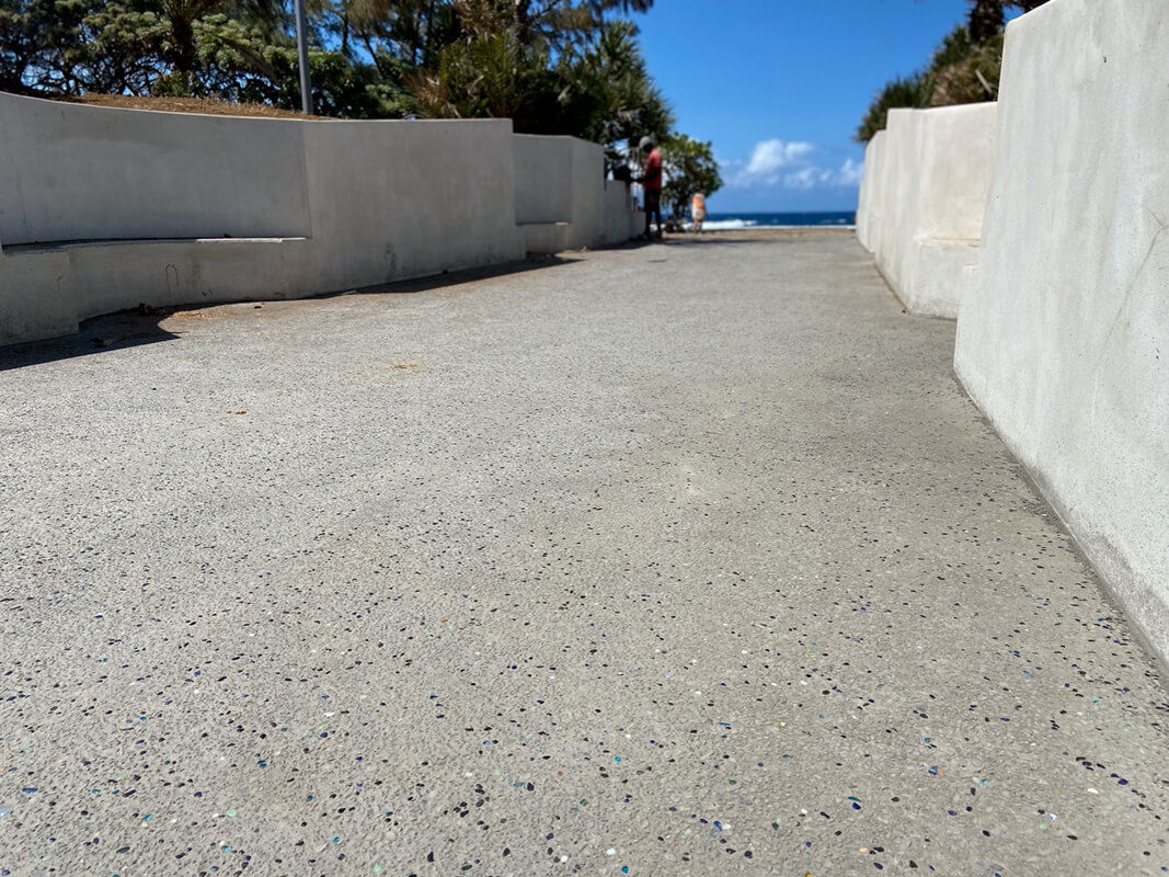 Réalisation d'un béton balayé : esthétique, résistant et polyvalent et bouchardé : antidérapant, durable, avec un aspect naturel. Ces deux finitions ont permis de garder une cohérence avec l'environnement du lieu.