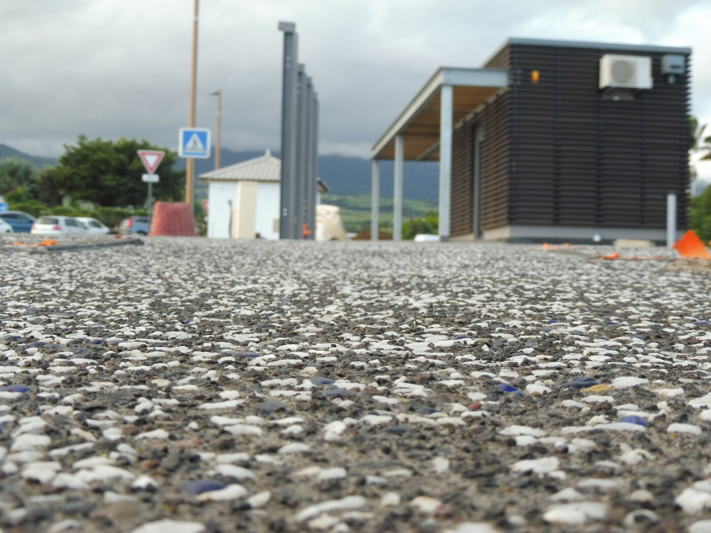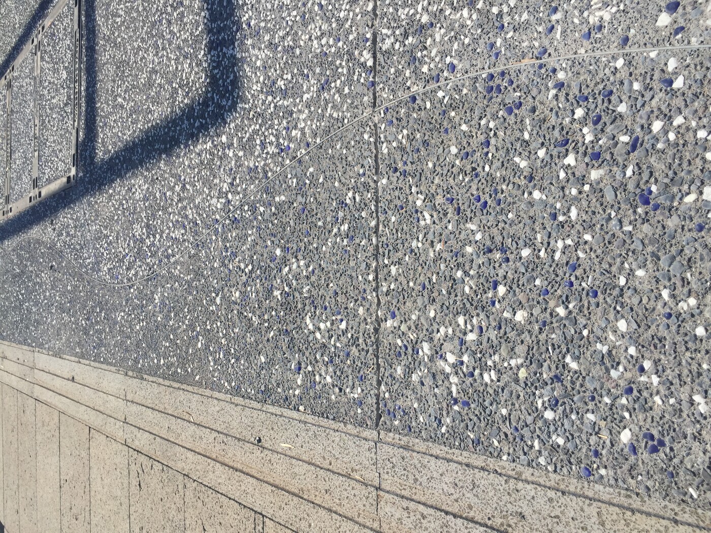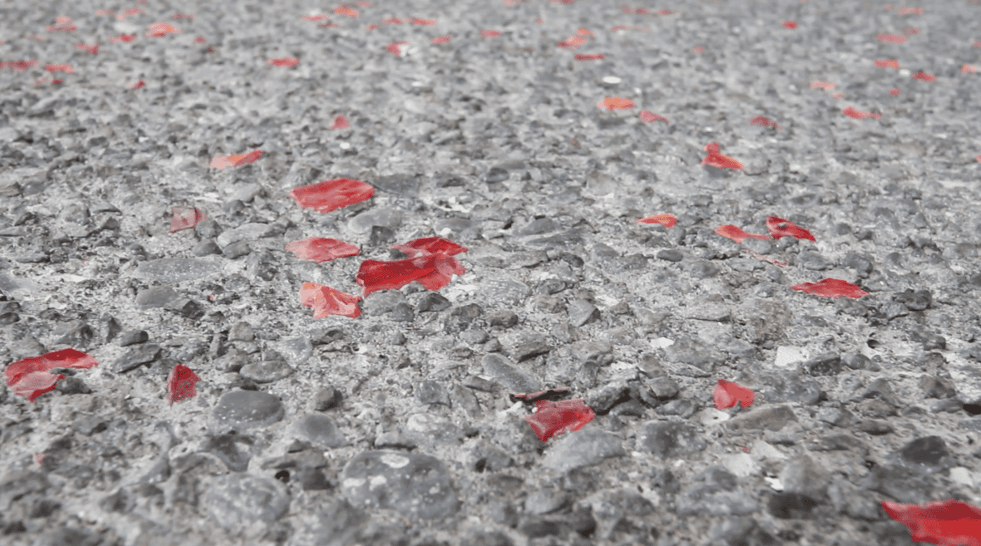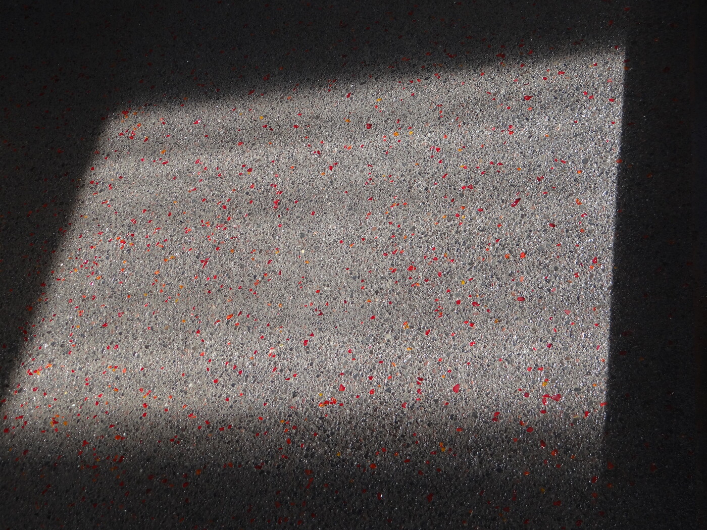 Les billes sont intégrées dans le béton encore frais, puis mises en lumière après le lavage qui révèle à la fois la matrice minérale noire et les inclusions colorées, donnant un effet scintillant et original en fonction de la lumière du jour ou des éclairages nocturnes.