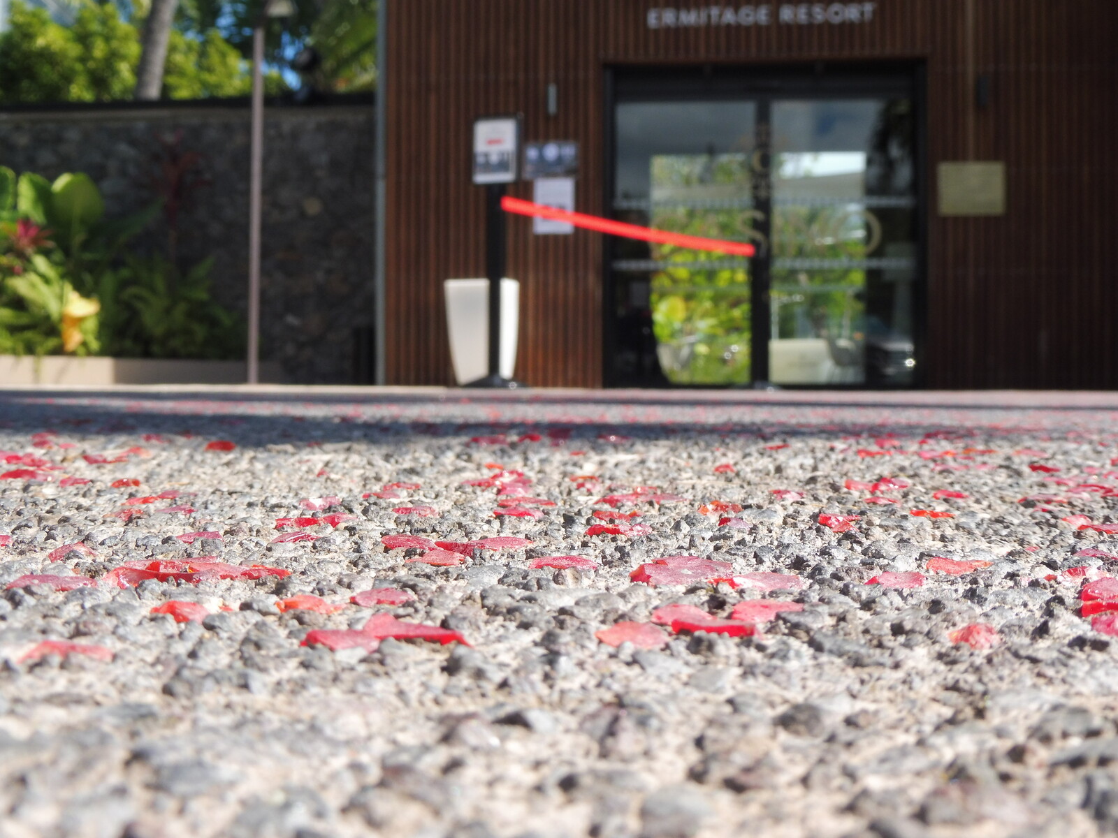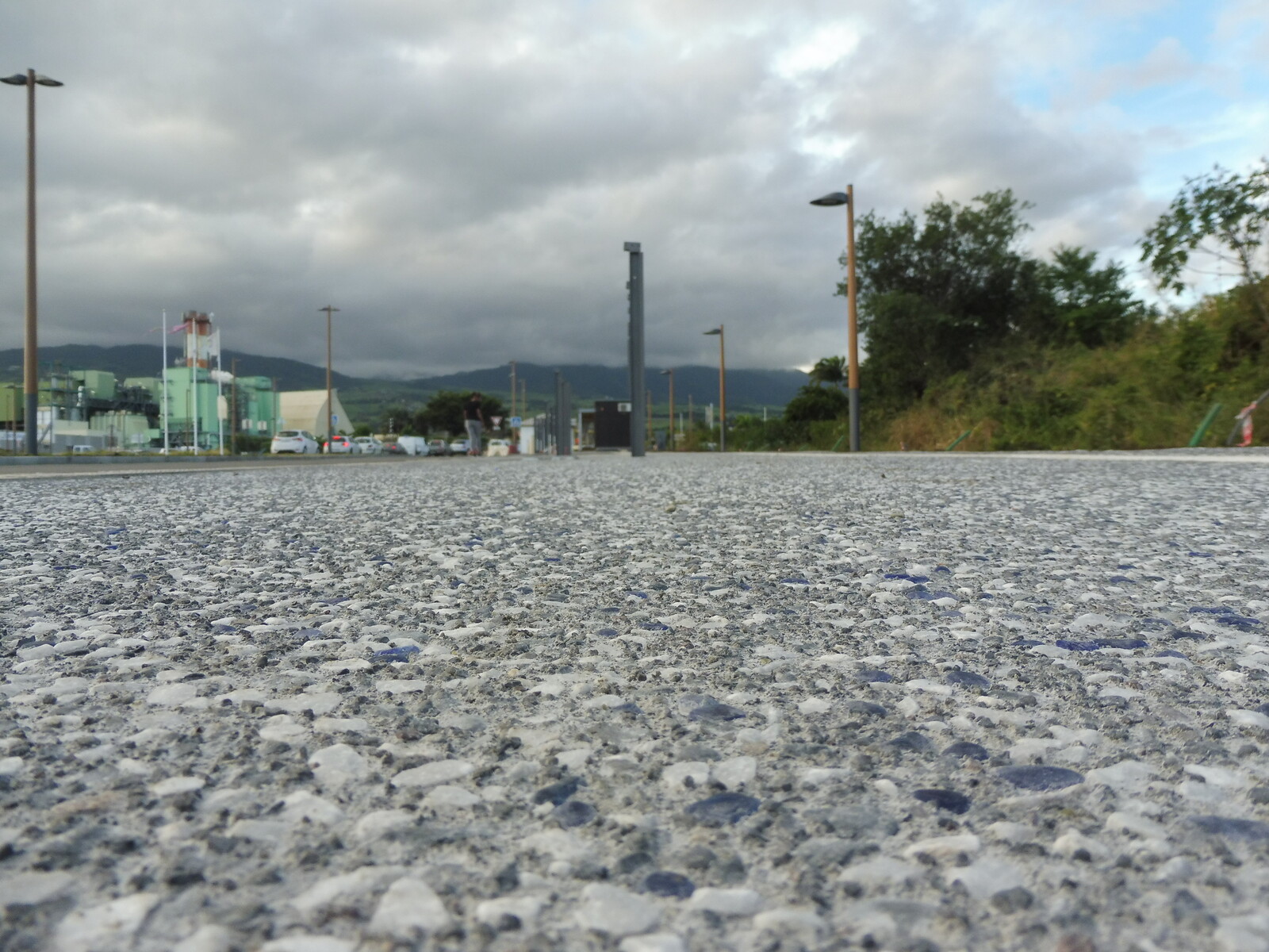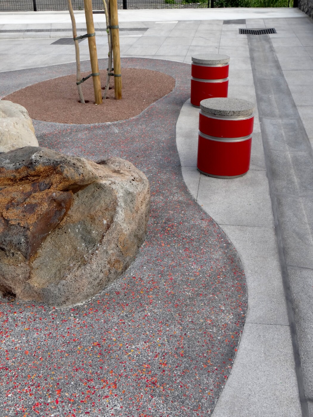 Les billes sont intégrées dans le béton encore frais, puis mises en lumière après le lavage qui révèle à la fois la matrice minérale noire et les inclusions colorées, donnant un effet scintillant et original en fonction de la lumière du jour ou des éclairages nocturnes.