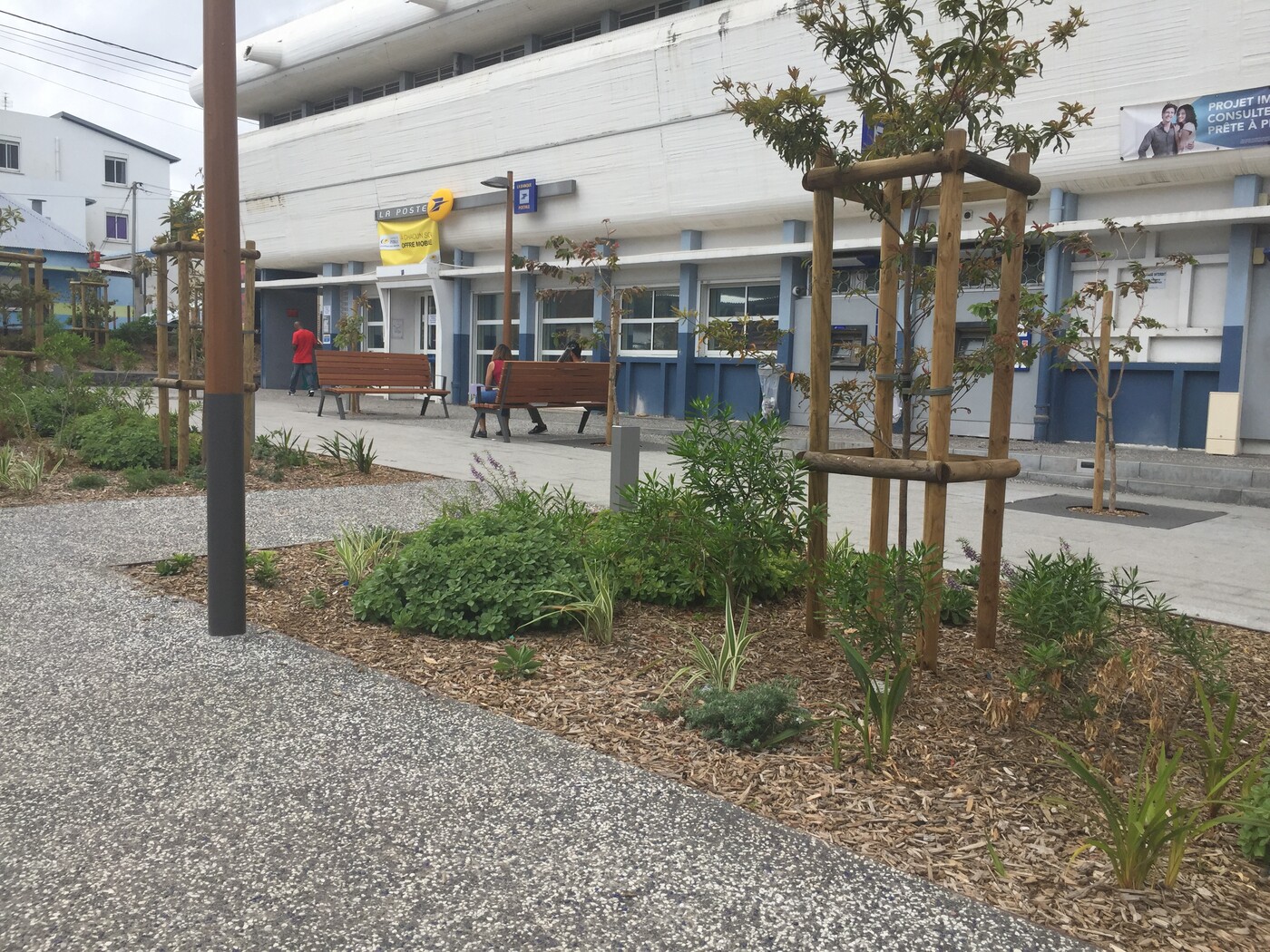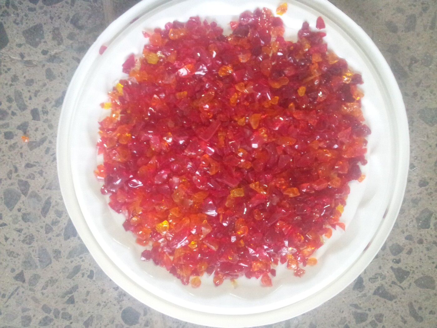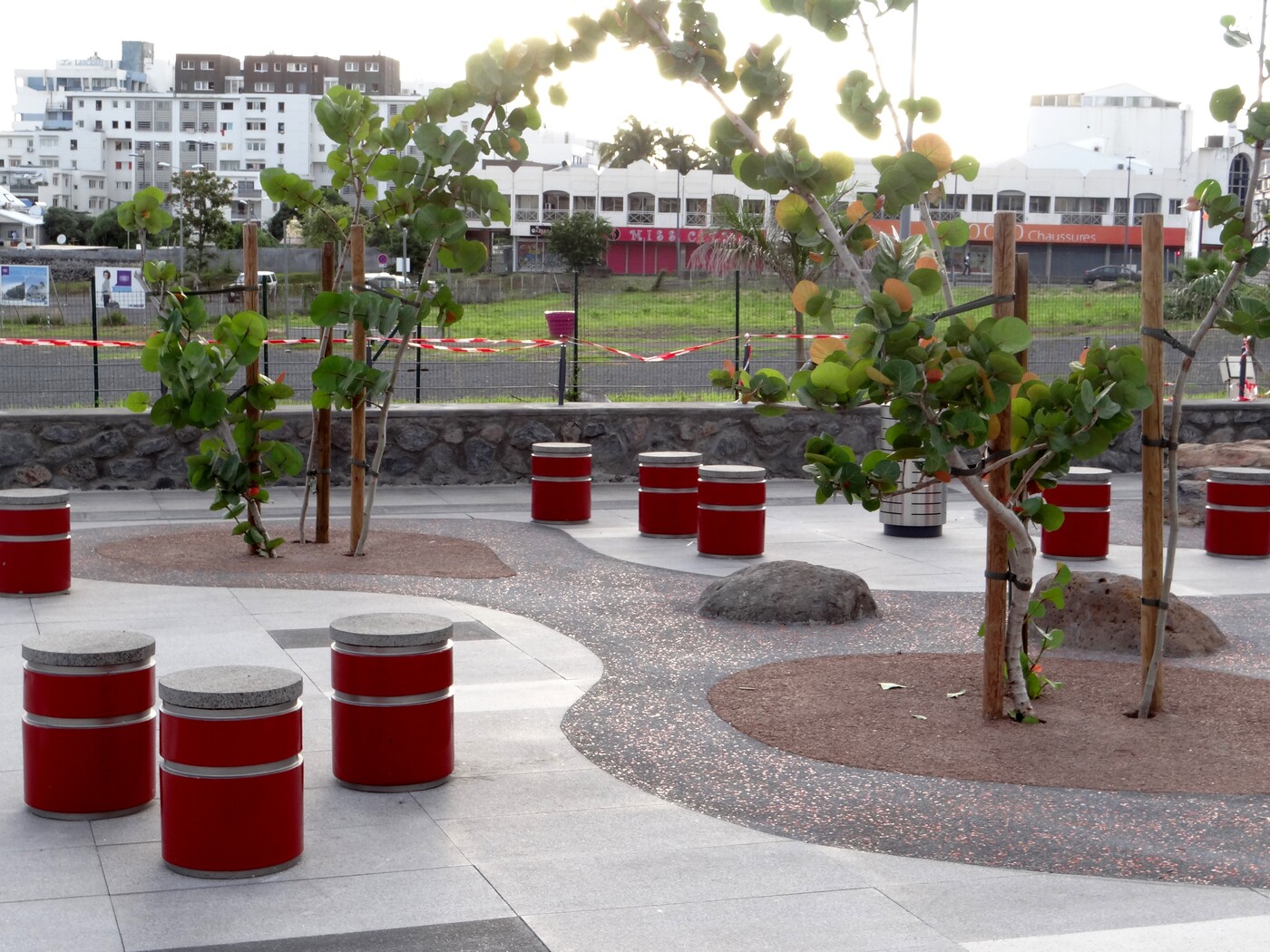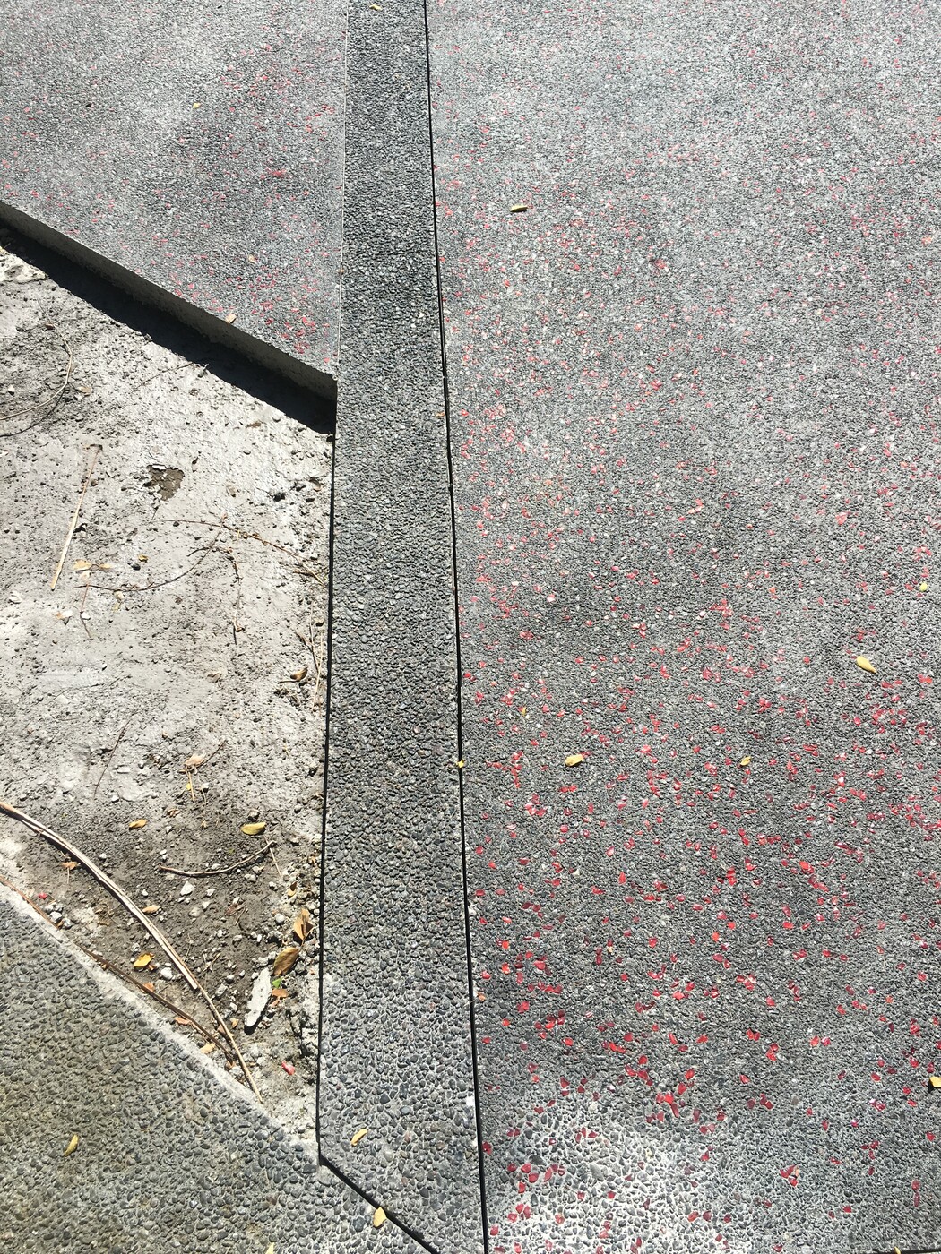Les billes sont intégrées dans le béton encore frais, puis mises en lumière après le lavage qui révèle à la fois la matrice minérale noire et les inclusions colorées, donnant un effet scintillant et original en fonction de la lumière du jour ou des éclairages nocturnes.