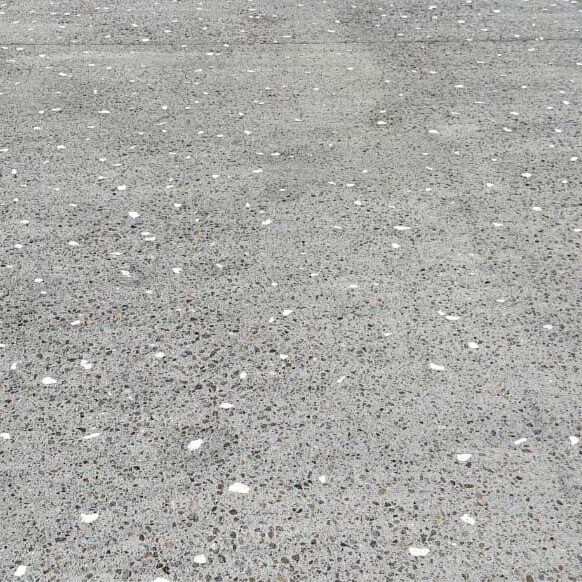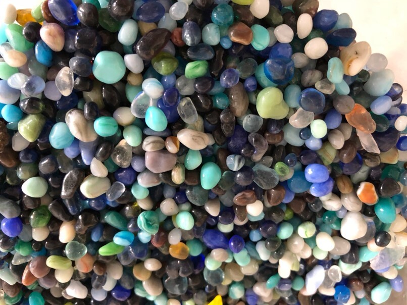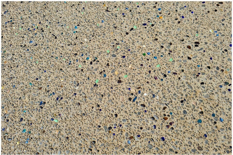 Ce béton décoratif consiste à insérer manuellement par cloutage des billes de verre coloré recyclé (bleu, vert, ambre, transparent…) à la surface d’un béton désactivé formulé à base de basalte.