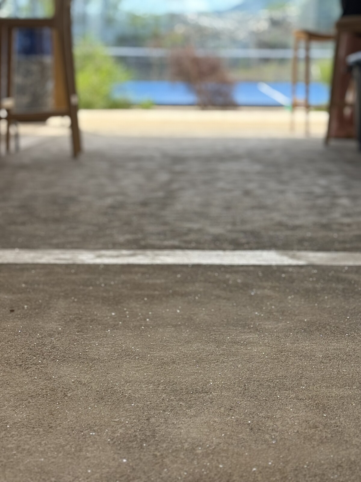Ce béton décoratif associe la finition gommée pochée, réalisée par sablage léger et régulier d’une surface de béton frais, avec l’insertion d’additifs scintillants dans la laitance. Ces micro-particules réfléchissantes, combinées à un durcisseur coloré, permettent au sol de scintiller avec les sources de lumière artificielle (lampadaires) ou la lumière naturelle (soleil).